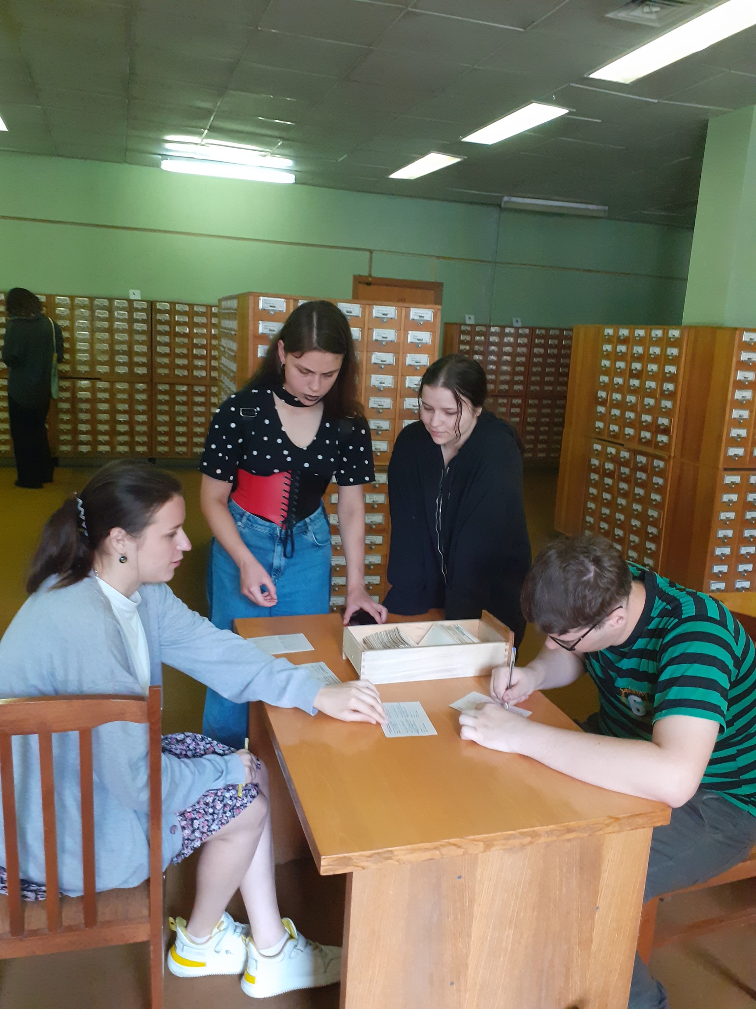 11 червня у стінах головного корпусу Національної бібліотеки України імені В.І. Вернадського студенти оволодівали навичками роботи з каталогами. Керівники практики О. Яковенко та Л. Коновал провели зі студентами квест, запропонувавши їм розділитися на дві групи та виконати низку завдань, а саме – знайти історичну літературу у різних каталогах (тематичному, авторефератів і дисертацій, періодичних видань тощо) і заповнити картки замовлення. Дві команди – «Жовтий автобус» і «Червоний автобус» –подолали перепони нової для майже всіх присутніх роботи. Автобуси успішно дісталися пункту призначення – моменту підведення підсумків і нагородження команд.