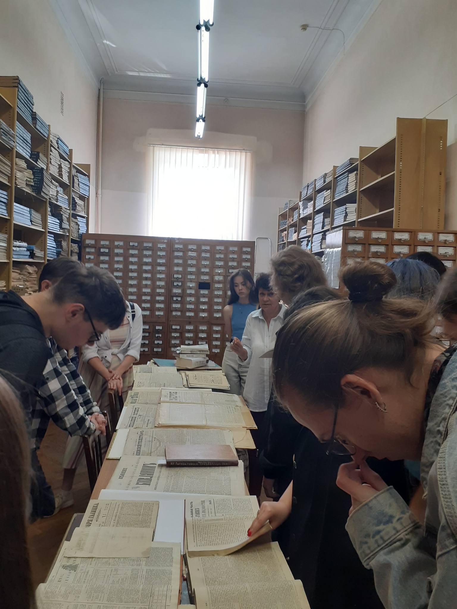 4 червня поточного року студенти-історики II курсу, які працюють на базі Національної бібліотеки України імені В. І. Вернадського за програмою бібліотечно-документознавчої практики під керівництвом провідних фахівців цієї установи – Людмили Коновал, завідувачки відділу технологій електронного науково-інформаційного обслуговування Інституту інформаційних технологій, кандидатки наук із соціальних комунікацій, та Олени Яковенко, завідувачки відділу теорії і методології бібліотечної справи Інституту бібліотекознавства, кандидатки історичних наук, ознайомилися з роботою структурних підрозділів НБУВ у корпусі на Голосіївському проспекті. Молодим людям розповіли про специфіку роботи з каталогами, про важливість праці з довідковими виданнями (цей відділ зацікавив студентів особливо, зроблені там світлини не постановочні), про роль мап у формуванні наших уявлень про Україну в світі та у розгортанні інформаційного протистояння в умовах російсько-української війни (працівниця відділу картографії змогла зацікавити всіх присутніх розглядом давніх картографічних матеріалів, що зберігаються в бібліотеці, привернувши увагу до особливих матеріалів, як-от мапа острова Зміїний початку XIX ст.). Робота другокурсників на практиці триває, їх очкують нові знайомства та нові відкриття.
