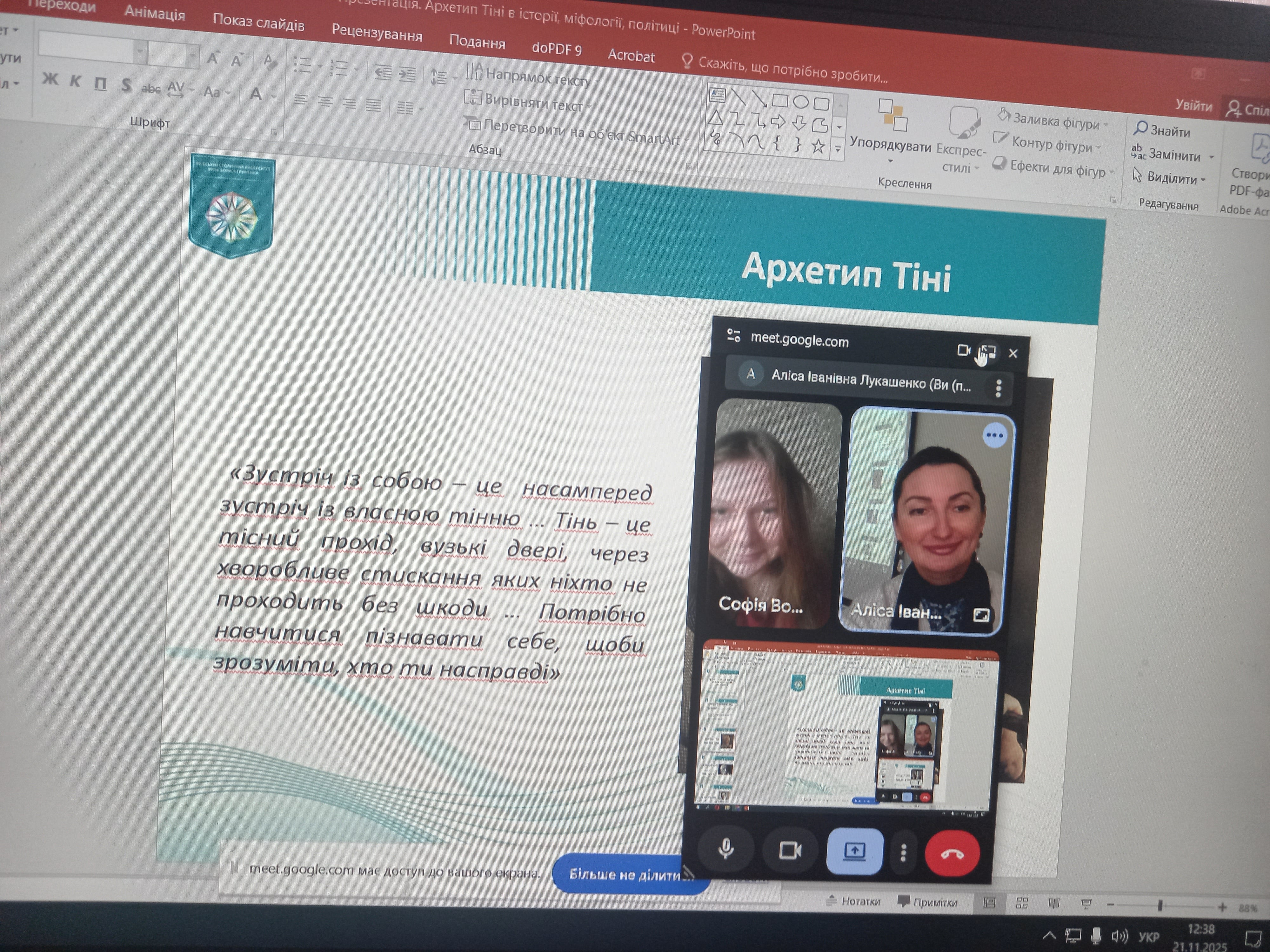 Учасники разом простежили, як мотив Тіні проявляється у світових міфах, історичних подіях та сучасній культурі, а також обговорили його вплив на поведінку спільнот і окремих людей. Особливу увагу приділили юнгіанському розумінню Тіні як прихованої частини особистості.