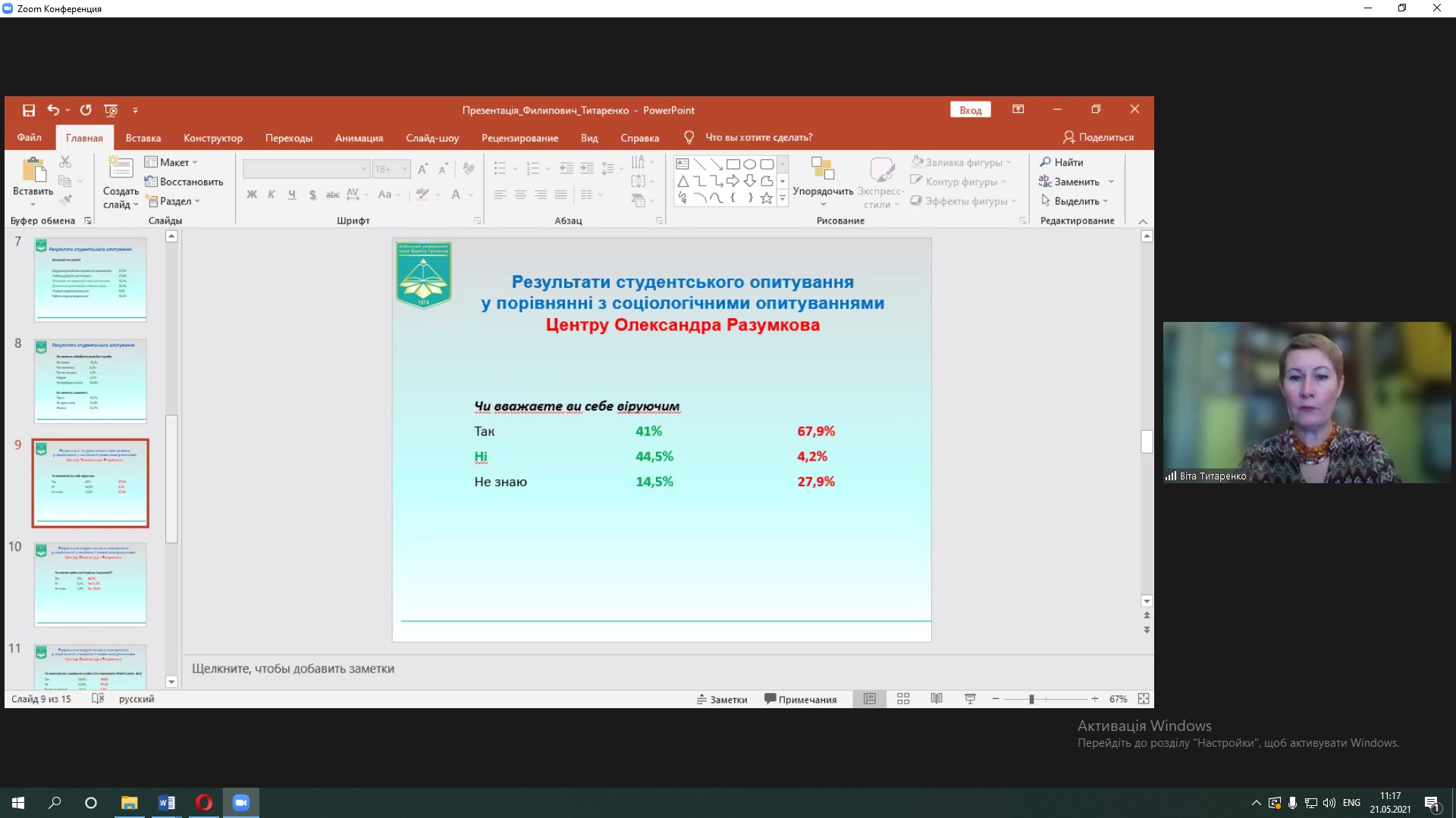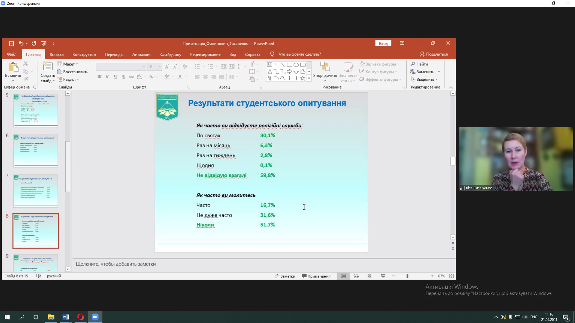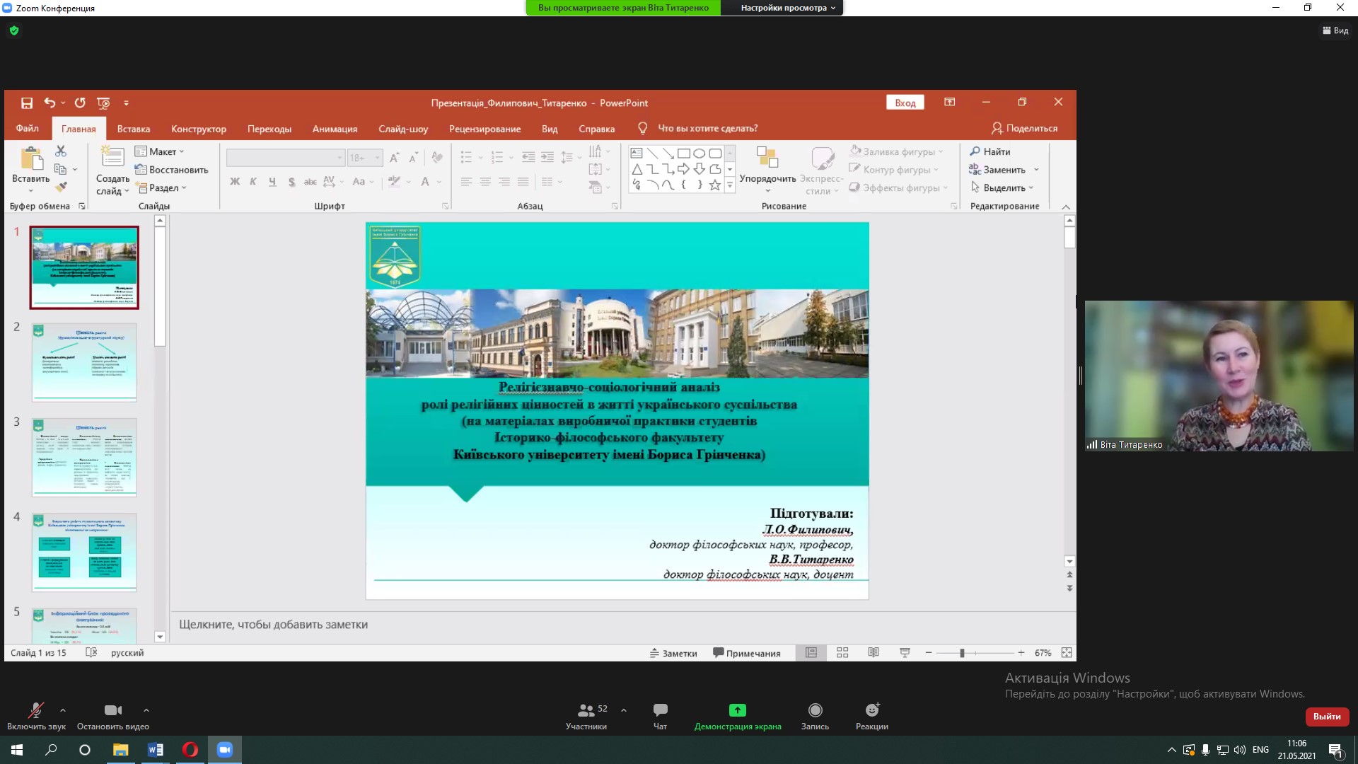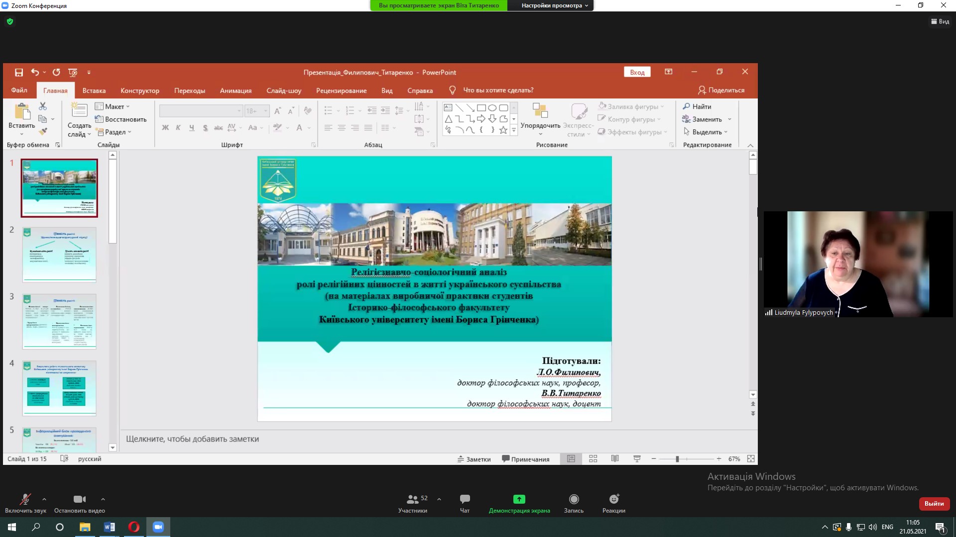Людмила Филипович, д. філос. н., проф., провідний науковий співробітник відділу релігієзнавства Інституту філософії імені Г.С. Сковороди і Віта Титаренко, д. філос. н., доцент, старший науковий співробітник Інституту філософії імені Г.С. Сковороди НАН України, проф. кафедри філософії Київського університету імені Бориса Грінченка узагальнили результати студентської виробничої практики і ознайомили учасників конференції з проведеним релігієзнавчо-соціологічним аналізом ролі релігійних цінностей в житті українського суспільства.