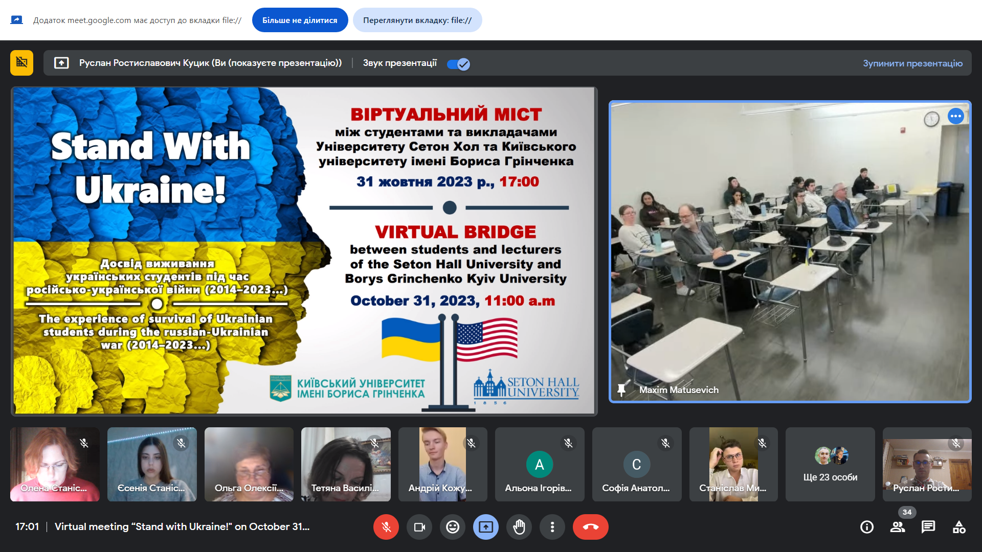 31 жовтня 2023 р. о 17:00 за київським часом (11:00 у Нью-Джерсі, США) відбулася онлайн-зустріч «Стій з Україною! Досвід виживання українських студентів під час російсько-української війни (2014-2023…)» між студентами та викладачами Сетон Холл Університету та Київського університету імені Бориса Грінченка. Міжнародна співпраця між двома університетами триває з 2008 р. і кафедра історії України Факультету суспільно-гуманітарних наук щороку організовує та проводить в межах цієї співпраці різні міжнародні заходи.