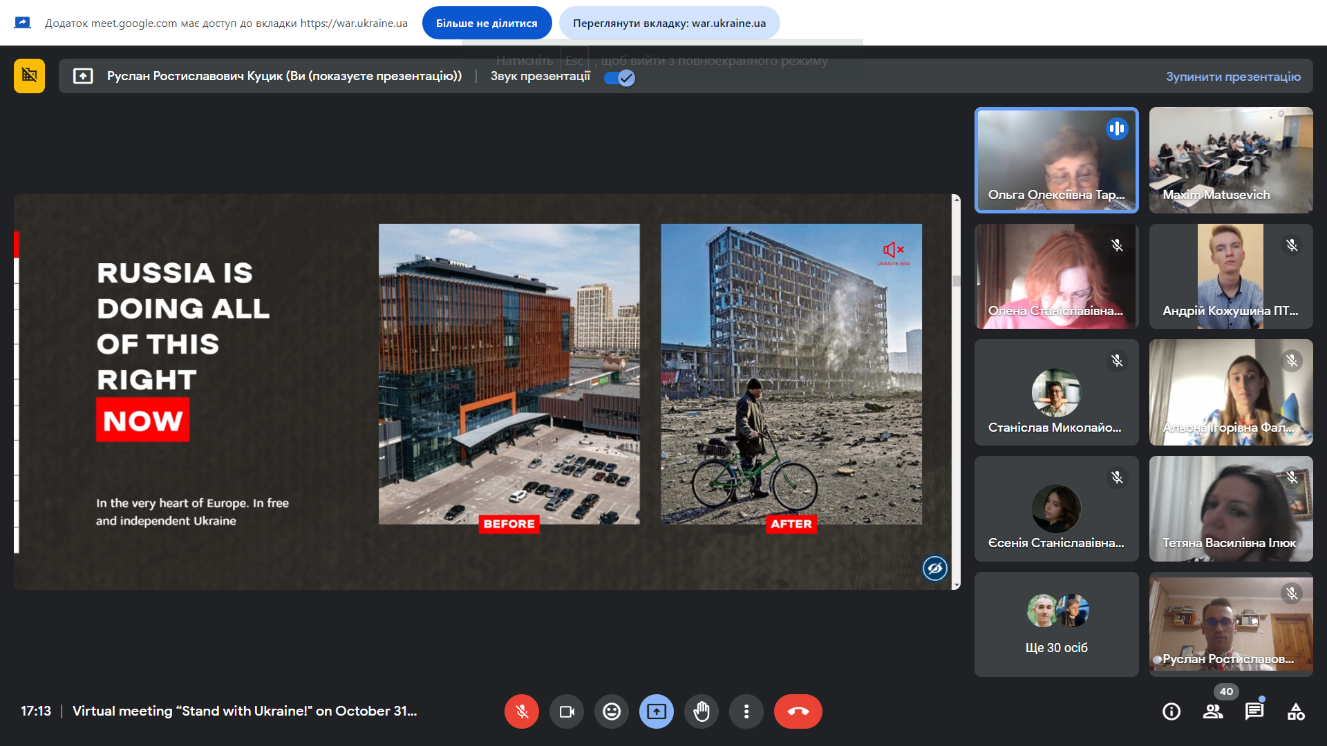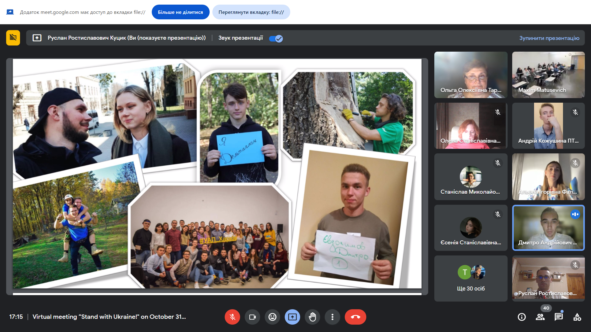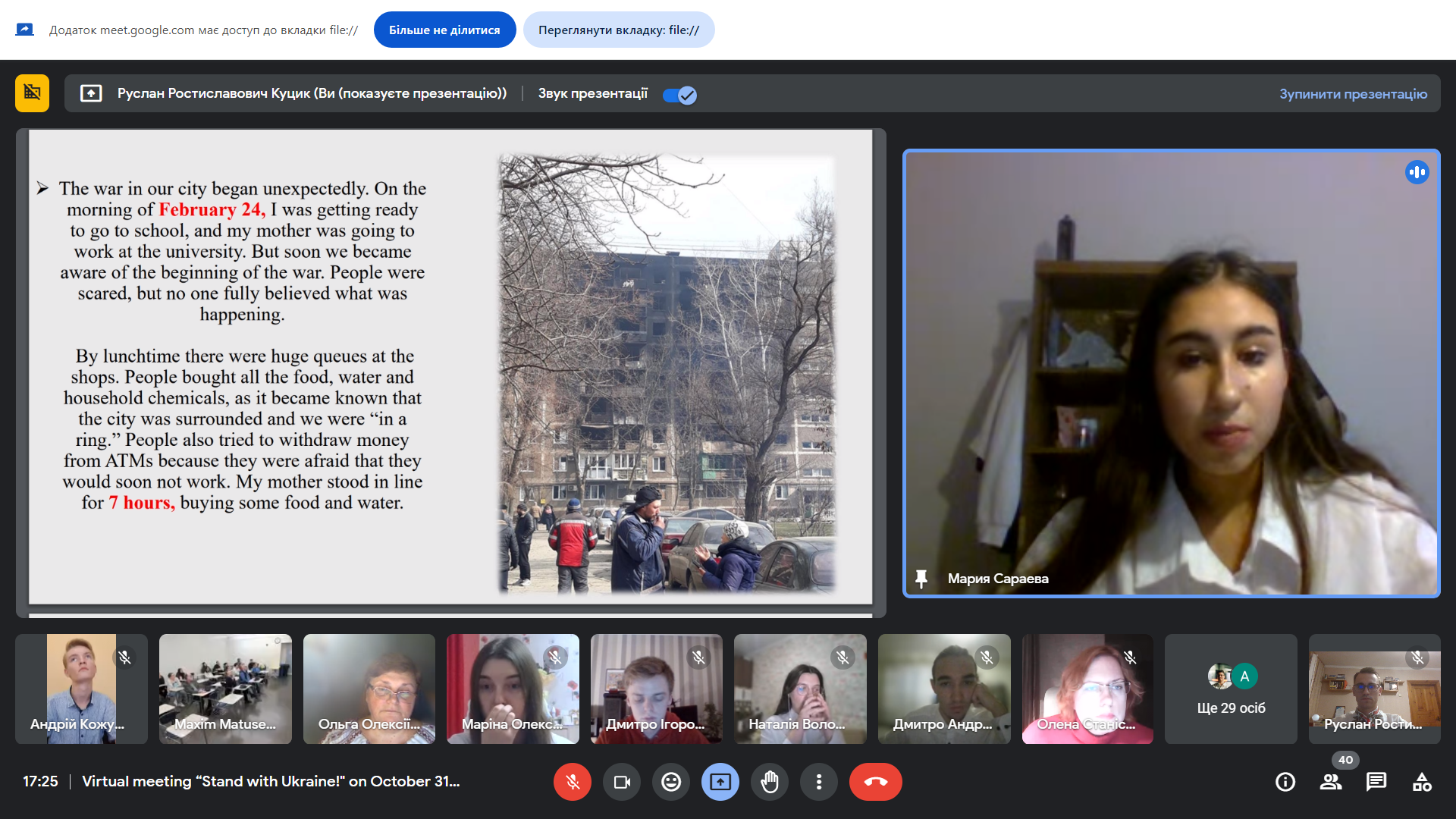 Американські слухачі з величезною емпатією сприйняли розповіді наших студентів про окуповані міста та території, зацікавились демонстрацією фотоподій та згадок із особистих архівів здобувачів, історіями українських студентів-Героїв, що поклали своє життя, захищаючи Україну.