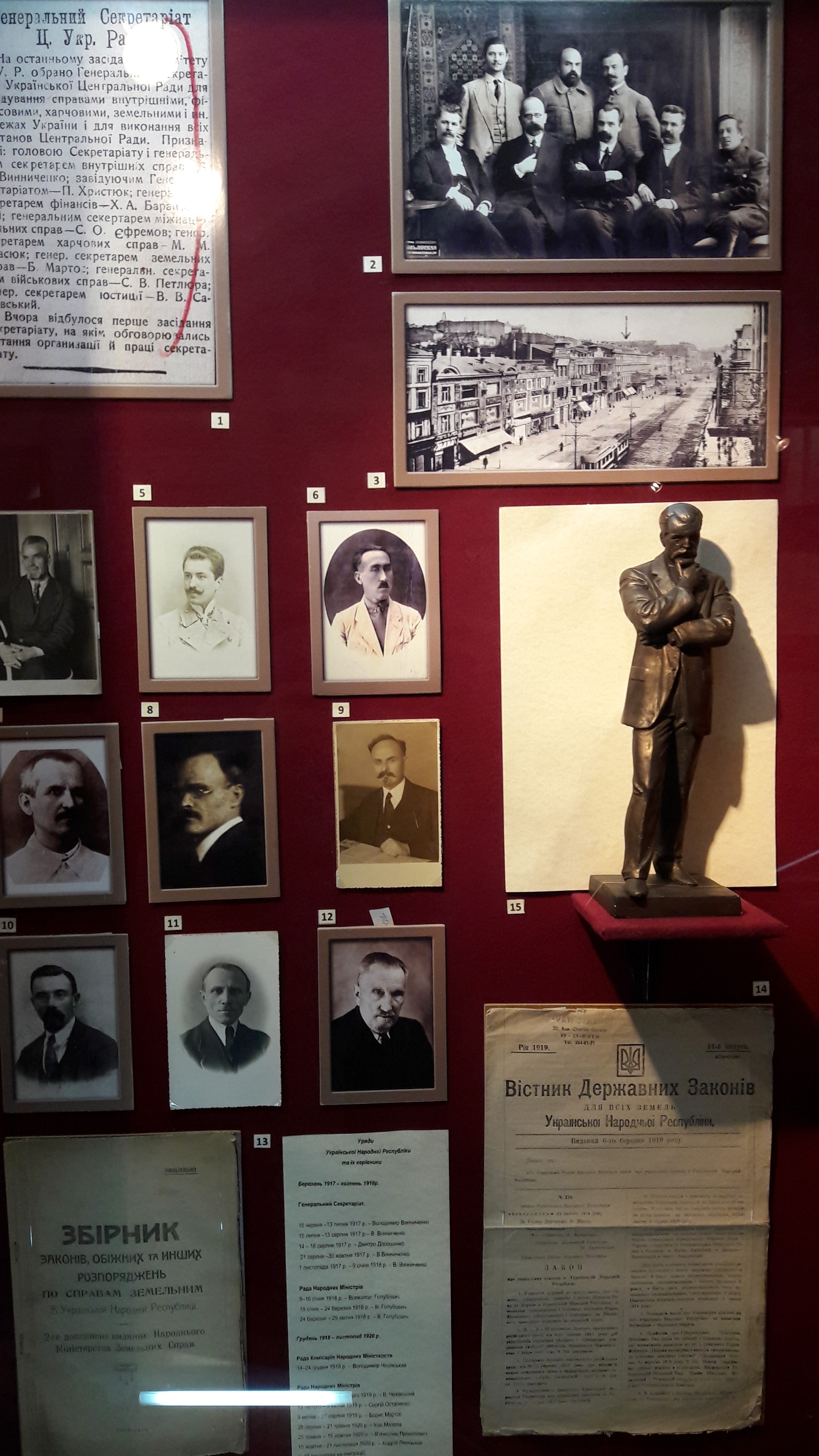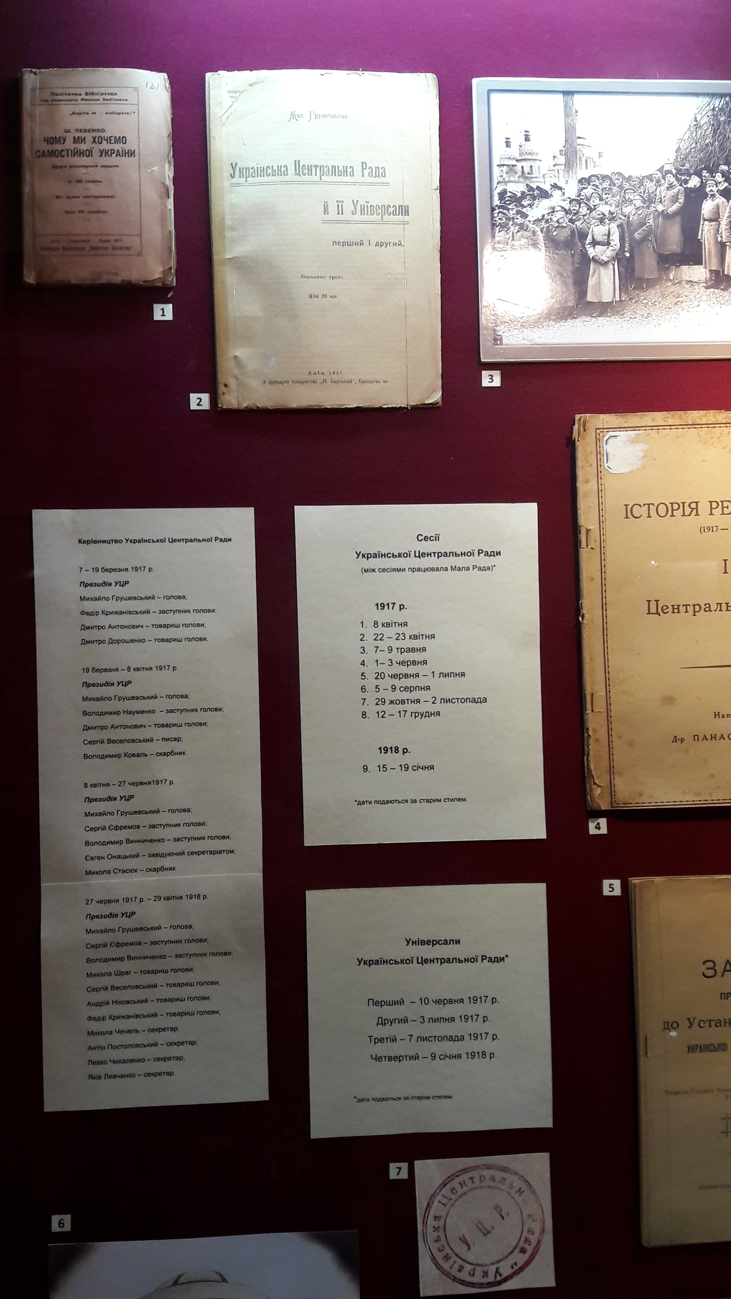 Розміщено експонати, що демонструють відзначення у 1914 р. століття від дня народження Тараса Шевченка, документи української громади Петербурга у 1917 р., особисті речі й унікальні документи полковника січових стрільців Євгена Коновальця, генерала Миколи Капустянського, полковника Романа Сушка.