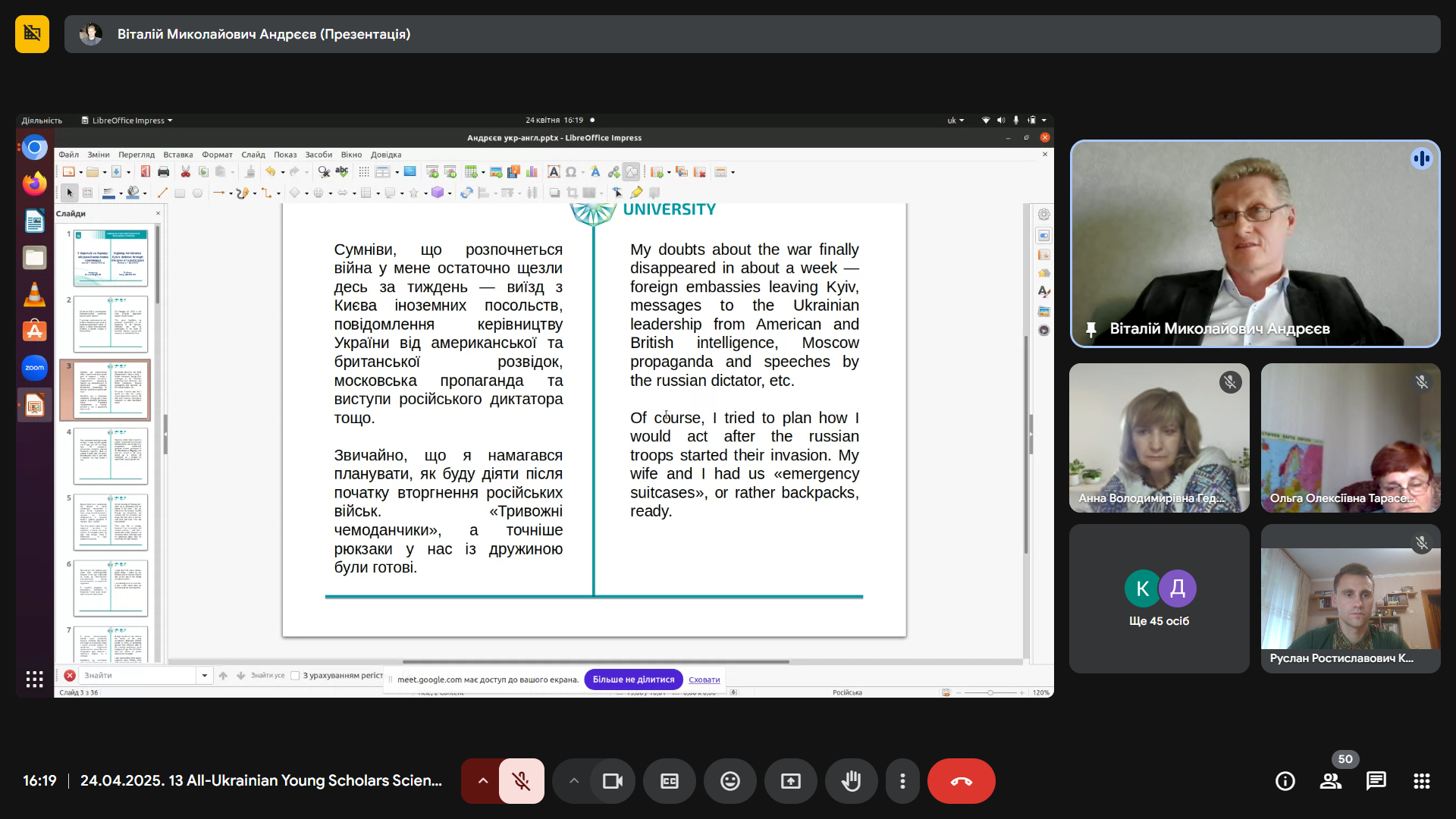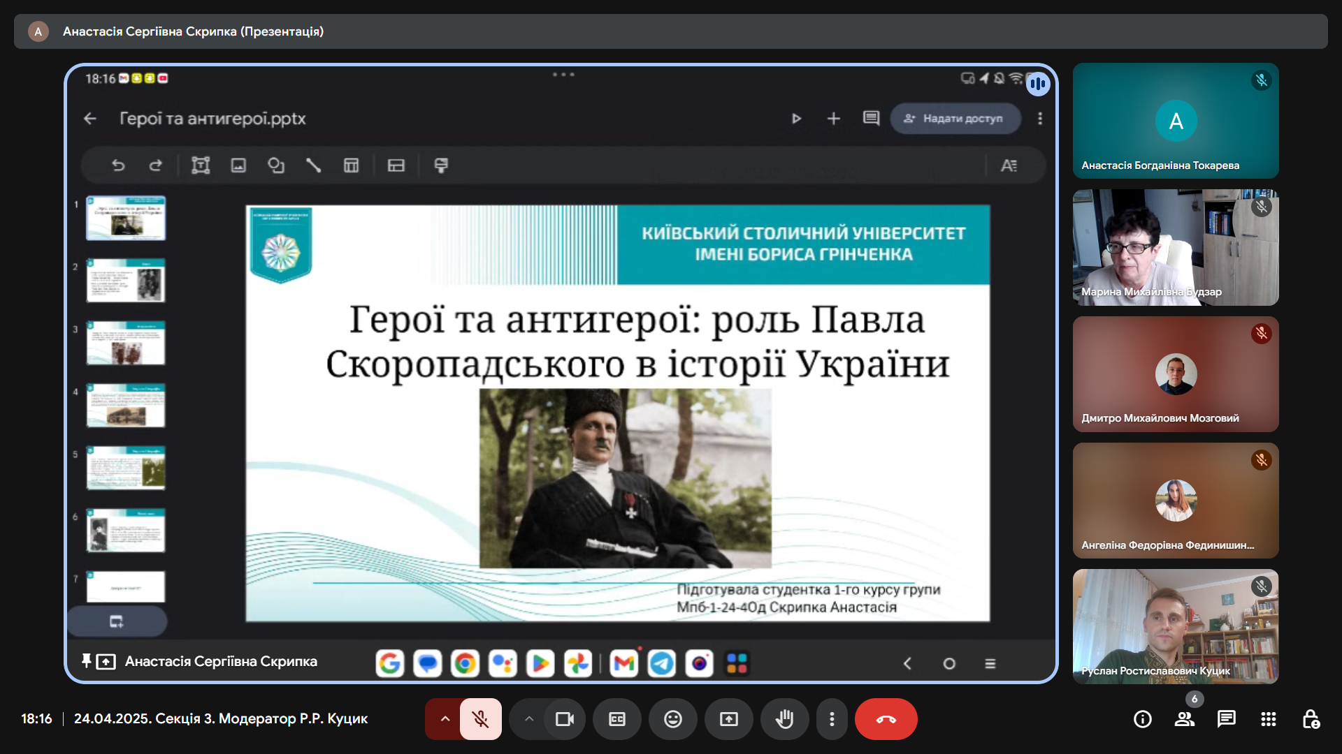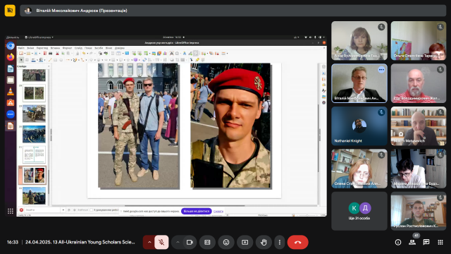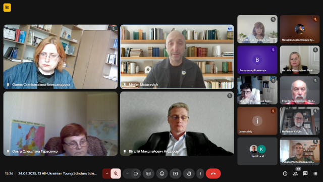 Професор кафедри історії України Віталій Андрєєв виступив з емоційною та правдивою розповіддю «У боротьбі за Україну: оборона Києва очима самовидця (лютий – квітень 2022 р.)». Його свідчення стали не лише цінним історичним джерелом, а й нагадуванням про героїзм і стійкість киян у перші, найважчі, дні повномасштабного вторгнення. Професор Андрєєв не лише аналізував події, він ділився особистими спогадами про початок ворожої навали, коли він разом із сином став на захист рідного міста. Його розповідь, супроводжувана світлинами тих трагічних днів, стала потужним нагадуванням про героїзм звичайних киян, які стали воїнами, про незламний дух нації, що повстала проти агресора. Цей виступ, сповнений болю та гідності, викликав глибокий емоційний відгук у присутніх, підкреслив нерозривний зв’язок між історичною наукою та живою історією, що твориться на наших очах.