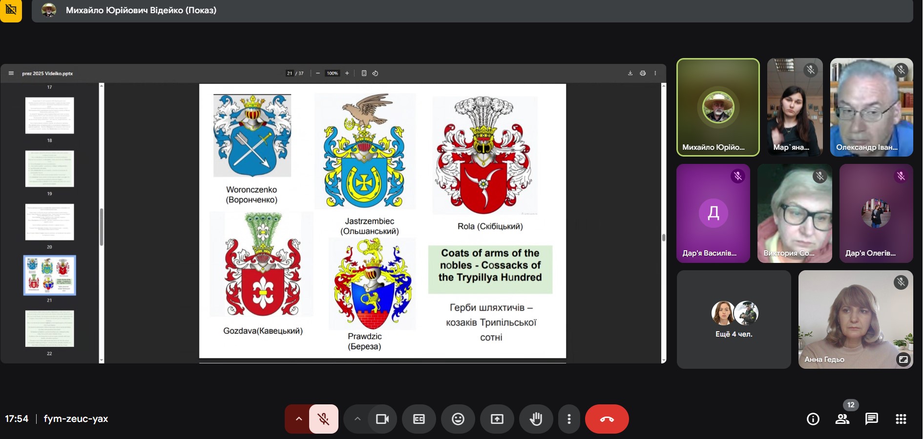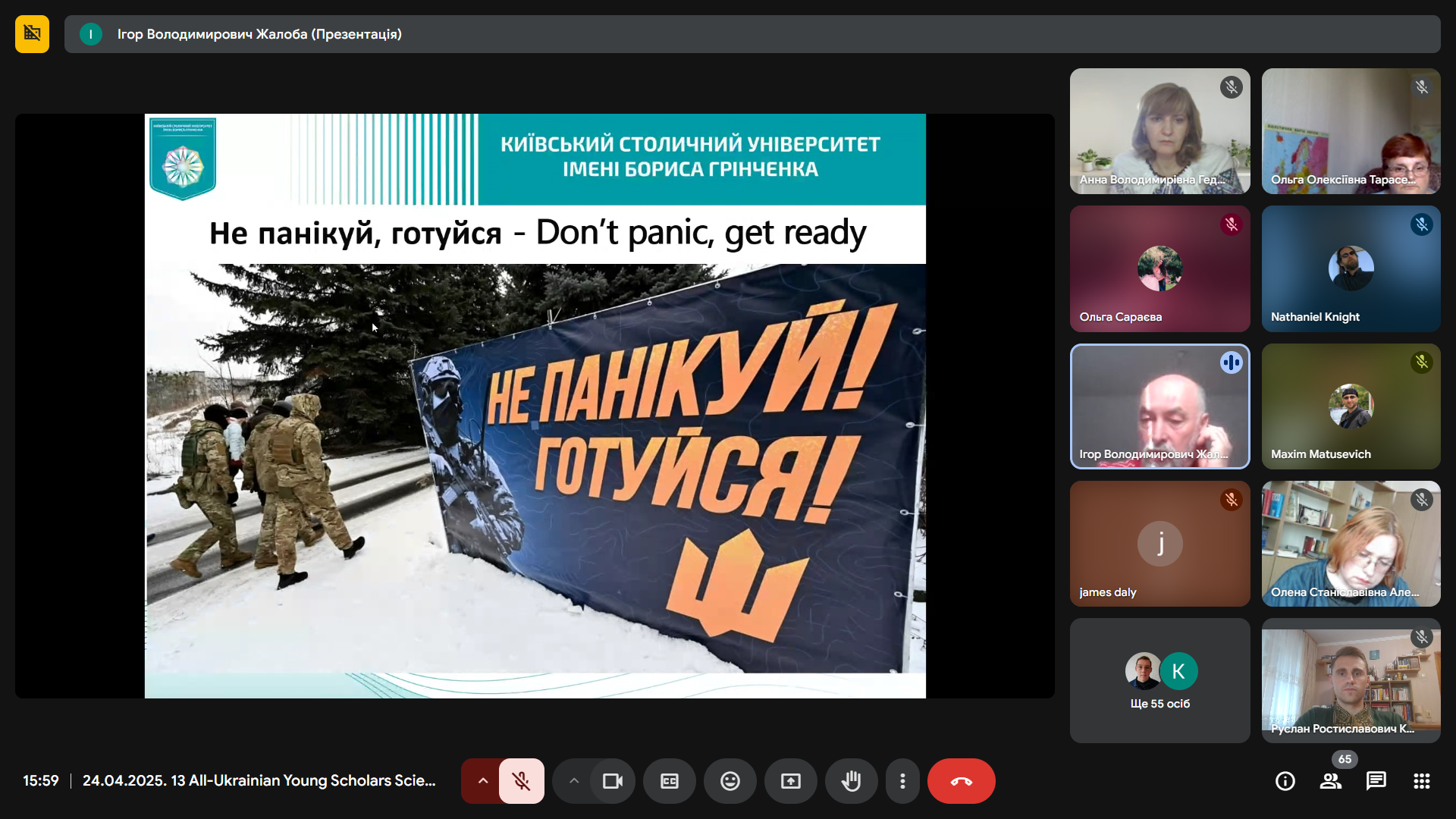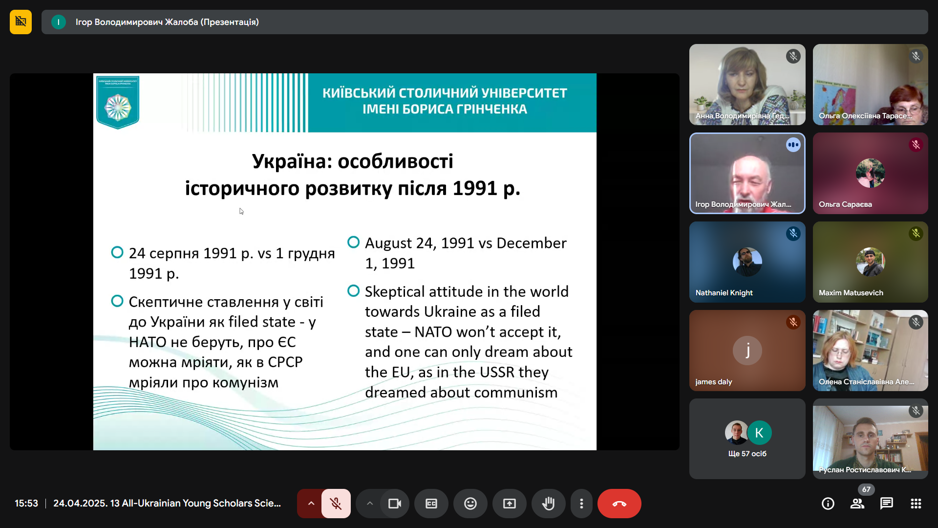 Професор кафедри історії України Віталій Андрєєв виступив з емоційною та правдивою розповіддю «У боротьбі за Україну: оборона Києва очима самовидця (лютий – квітень 2022 р.)». Його свідчення стали не лише цінним історичним джерелом, а й нагадуванням про героїзм і стійкість киян у перші, найважчі, дні повномасштабного вторгнення. Професор Андрєєв не лише аналізував події, він ділився особистими спогадами про початок ворожої навали, коли він разом із сином став на захист рідного міста. Його розповідь, супроводжувана світлинами тих трагічних днів, стала потужним нагадуванням про героїзм звичайних киян, які стали воїнами, про незламний дух нації, що повстала проти агресора. Цей виступ, сповнений болю та гідності, викликав глибокий емоційний відгук у присутніх, підкреслив нерозривний зв’язок між історичною наукою та живою історією, що твориться на наших очах.