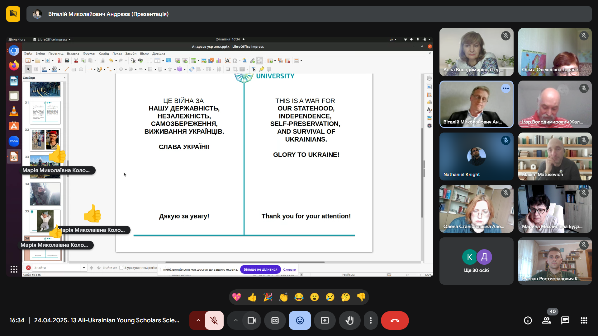 У роботі конференції взяли участь не лише українські науковці, а й наші вірні друзі з провідних вищих навчальних закладів світу: Університету Сетон Хол (США), Оксфордського університету (Велика Британія), Варшавського університету (Польща). Їхня підтримка й солідарність є безцінними у цей надважкий для України час.