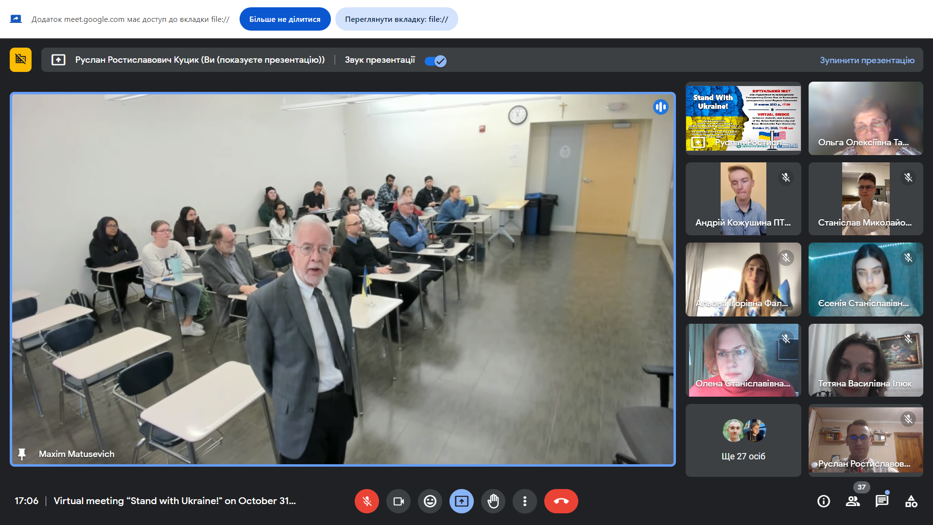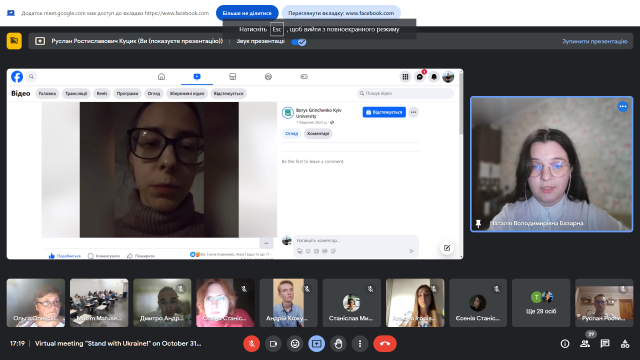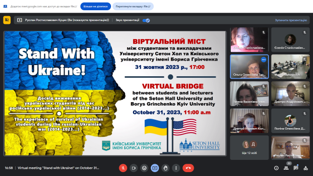 31 жовтня 2023 р. о 17:00 за київським часом (11:00 у Нью-Джерсі, США) відбулася онлайн-зустріч «Стій з Україною! Досвід виживання українських студентів під час російсько-української війни (2014-2023…)» між студентами та викладачами Сетон Холл Університету та Київського університету імені Бориса Грінченка. Міжнародна співпраця між двома університетами триває з 2008 р. і кафедра історії України Факультету суспільно-гуманітарних наук щороку організовує та проводить в межах цієї співпраці різні міжнародні заходи.